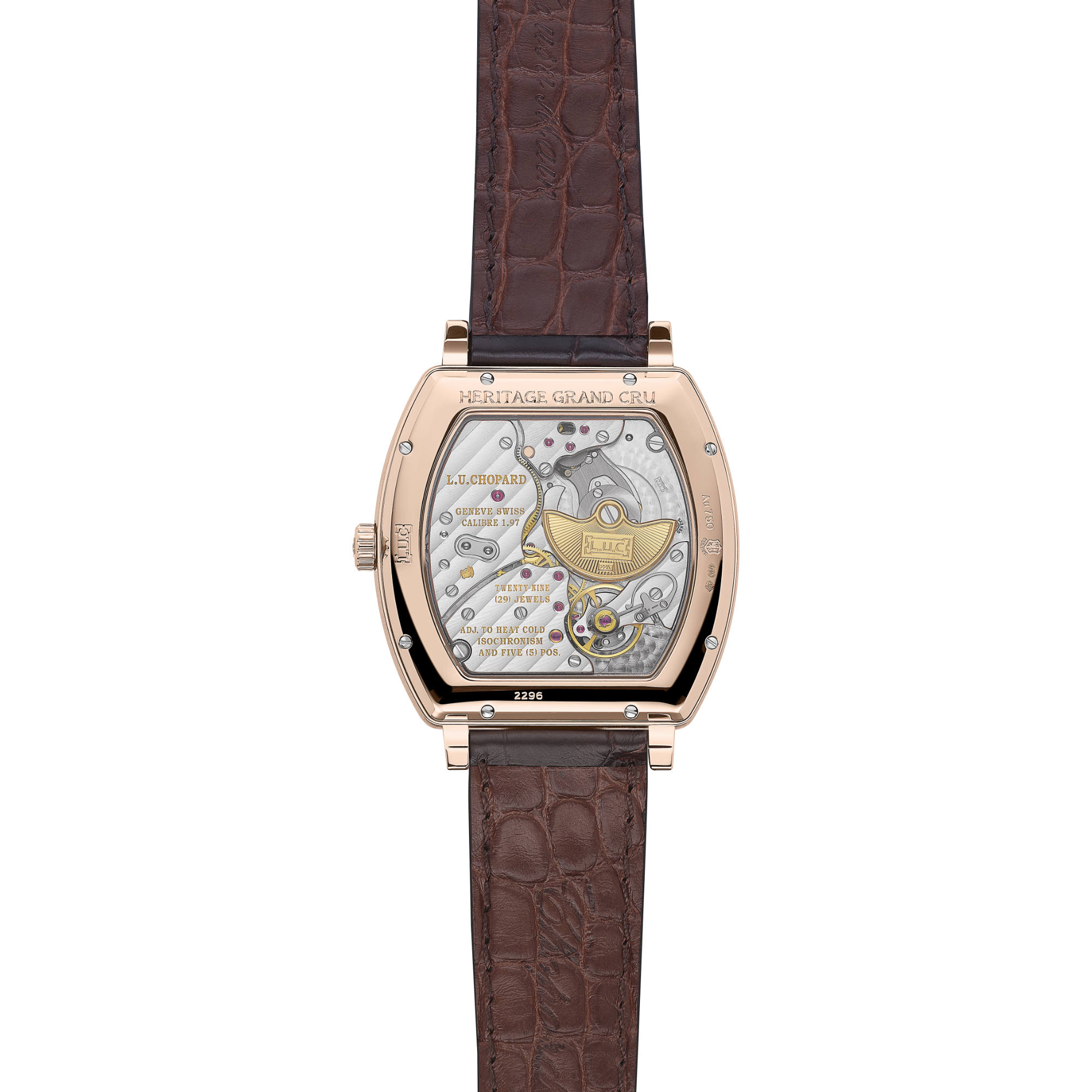 Ref. 162296-5001 - Chopard bereichert sein Sortiment um einen Chronometer in Tonneau-Form aus 18 Karat Roségold. Er wurde entworfen wie ein Ausnahmewein und stützt sich auf das Beste des uhrmacherischen Know-hows von Chopard. Die L.U.C Heritage Grand Cru besticht mit ihrem besonders flachen, anmutig geformten Design und ihrer besonderen Eleganz. Darüber hinaus ist sie eine der wenigen Uhren in Tonneau-Form mit einem Automatikwerk in derselben Form, dem L.U.C 97.01-L. Sie ist eine Referenz an die von Louis-Ulysse Chopard entworfenen Taschenuhren. Ebenso wie edler Wein klassifiziert und zertifiziert wird, wurde diese herausragende handwerkliche Kunstwerk mit der Genfer Punze und die Präzision als Chronometerklassifizierung von der COSC ausgezeichnet. Es ist mit der Twin-Technologie von Chopard ausgestattet und bietet daher eine angenehme Autonomie von 65 Stunden. Die L.U.C Heritage Grand Cru ist in vielerei Hinsicht einzigartig und adelt einen anspruchsvollen Mann, der edle Weine und herausragenden Uhren sammelt: ein moderner Genussmensch, der Chopard Gentleman von heute.
