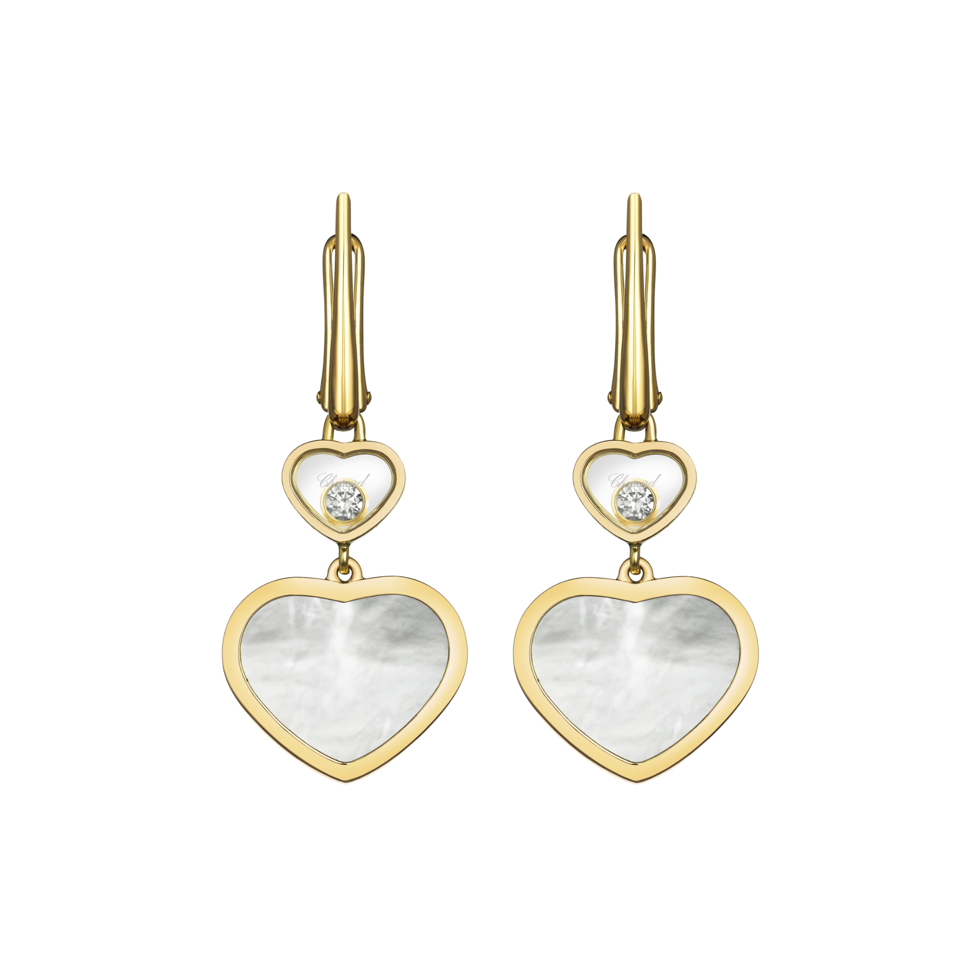 Ref. 837482-0310 - Die „Happy Hearts“-Reihe stellt das Herz als symbolisches Motiv der „Happy Diamonds“-Kollektion in den Mittelpunkt und interpretiert es mit unbeschwerter Kreativität. Die zeitlosen Ohrhänger aus 18 Karat Gelbgold offenbaren elegante Herzen aus natürlichem Perlmutt, die an kleineren Herzen aufgehängt sind, in denen jeweils einer der berühmten, frei beweglichen Diamanten von Chopard sich einem funkelnden Tanz der Liebe hingibt.