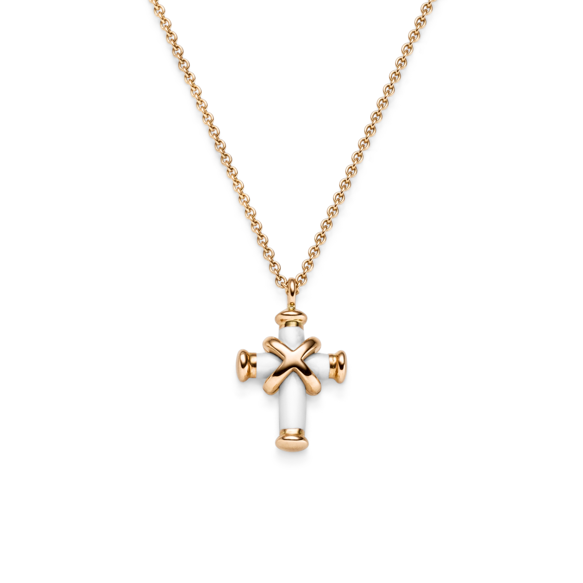 Ref. 34-1035773-0002 - Das Leo Wittwer Kreuz ist eine Ikone der Manufaktur. Diese Variante des Kreuzes setzt ein Statement mit modernem Look-and-Feel. Das minimalistische Design aus poliertem Roségold wird ergänzt durch helles Kaltemaille, das dem Anhänger eine Ausstrahlung voller Wärme und Eleganz verleiht. Der typische Überschlag ist ebenfalls in poliertem Roségold gehalten, der durch den Kontrast zum Kaltemaille besonders gut zur Geltung kommt und das unverkennbare Design des Kreuzes unterstreicht. Das Kreuz hängt an einer filigranen Kette aus Roségold, die angenehm auf der Haut liegt und den stilvollen Schmuck mit höchstem Tragekomfort verbindet.