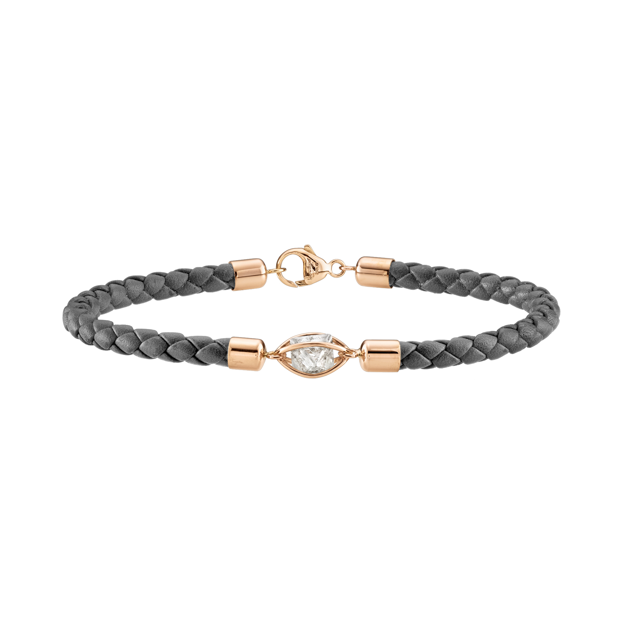 Ref. 34-1035773-0003 - Dieses Armband aus geflochtenen Leder präsentiert den ungeschliffenen, naturbelassenen Rough Cut® Diamanten in einem offenen, handgefertigten Gehäuse aus filigranem Golddraht, das einen Lichteinfall von allen Seiten erlaubt und seinen einzigartigen Charakter von allen Seiten erlebbar macht. Die Schönheit der Natur wird durch das Zusammenspiel der edlen Materialien zum Ausdruck gebracht. Zum Verschluss dient ein Karabinerhaken aus Roségold.