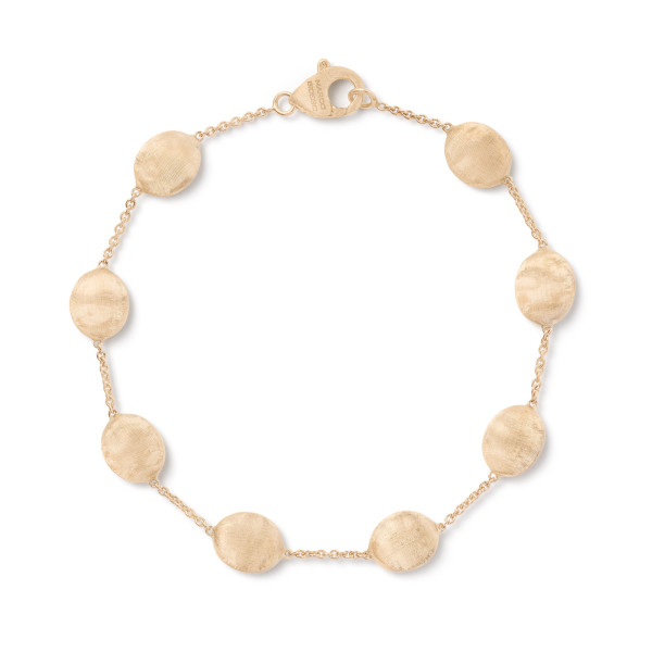 Ref. BB538 Y - Dieses elegante und zeitlose Armband besteht aus einer Kette mit ovalen Elementen aus Gelbgold in 18 Karat, deren unregelmäßige Oberfläche in einer antiken Technik mit dem Fadenstichel von Hand graviert ist, um eine zarte, unregelmäßige Satinierung zu erzielen.