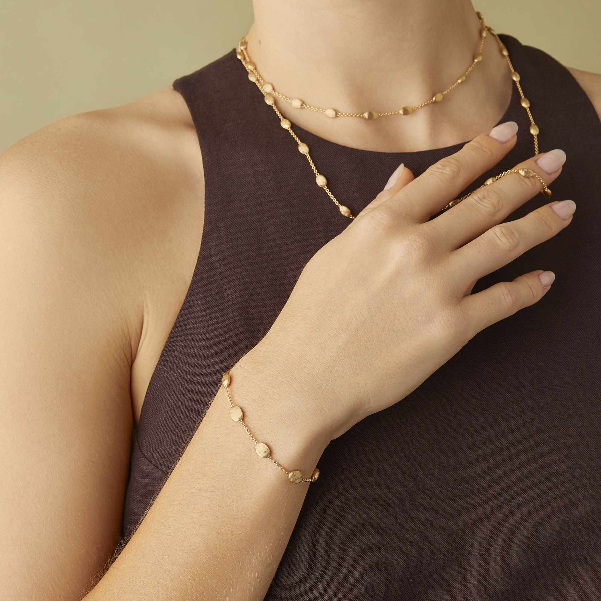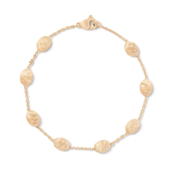 Ref. BB553 Y - Dieses leichte, zarte Armband besteht aus kleinen ovalen Elementen aus Gelbgold mit 18 Karat, deren unregelmäßige Oberfläche in einer antiken Technik mit dem Fadenstichel von Hand graviert ist, um eine zarte, unregelmäßige Satinierung zu erzielen.