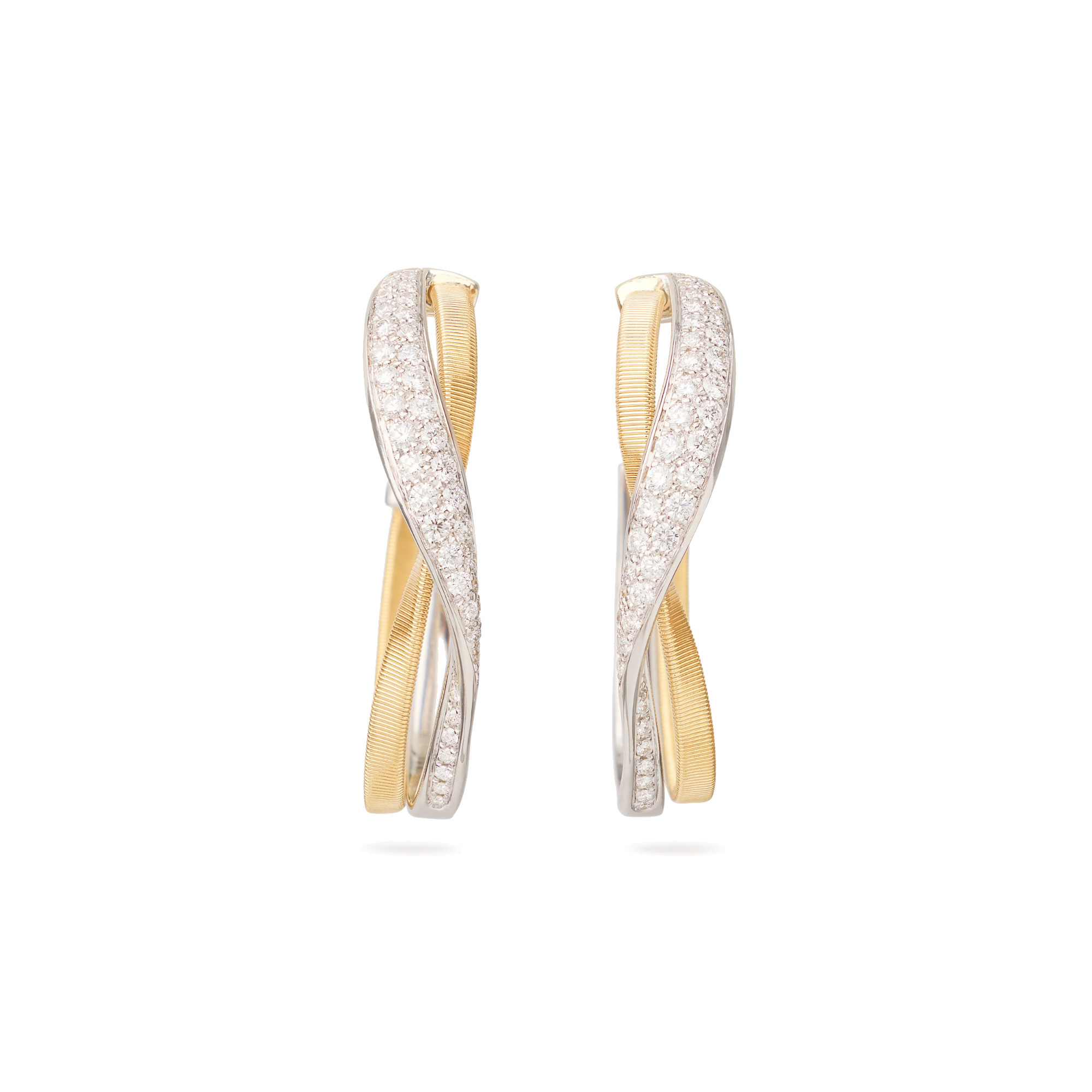 Ref. OG421 B1 YW - Diese ebenso kühnen wie raffinierten Ohrringe aus 18 Karat Gelbgold wurden in der exklusiven Coil-Technik gefertigt. Zwei zart gedrehte Bänder umschlingen einander in einem dynamischen Spiel von Volumen und Formen. Sie sind verziert mit einem Diamantpavé in Brillantschliff, das bei jeder Bewegung das Licht einfängt. Das Ergebnis ist ein raffinierter Kontrast von Licht und Form, der eine zeitlose Eleganz inszeniert.
