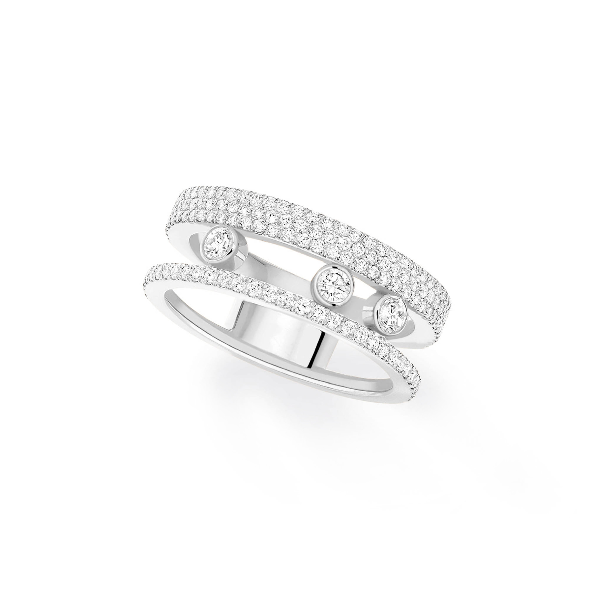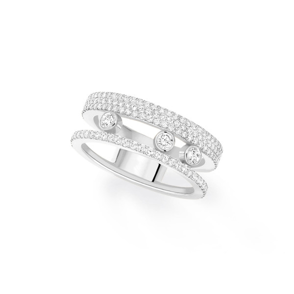 Ref. 07128-WG - Romane. Grafisches Design. Ein Stil. Dieser Diamantring aus 18 Karat Weißgold im Anhäufungsstil setzt auf die Verbindung eines mit Diamanten in Mikro-Fassung ausgefassten Eherings und einem in Kornfassung mit Diamanten ausgefassten Eherings. Im Herzen ihres grafischen und klaren Designs bewegt sich ein Diamant. Drei Diamanten sind das perfekte Symbol für die Liebe von gestern, heute und morgen. Eine gerade, luftige Linie für einen absolut modischen Diamantring aus Roségold. Der Glanz des Weißgoldes verstärkt die Reinheit der Diamanten und somit ihr atemberaubendes Schillern. Entdecken Sie den Diamantschmuck und die Diamantringe aus Roségold aus der Kollektion Move Romane: Kühne Kreationen zwischen Modernität und Originalität.