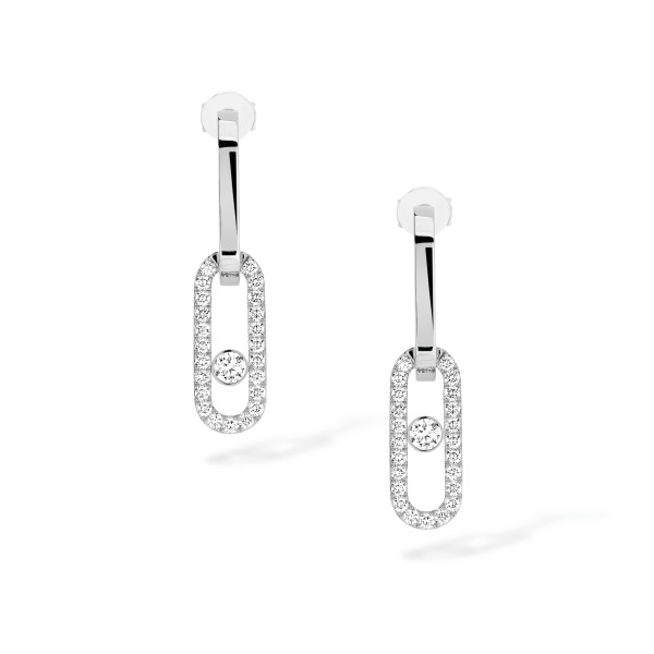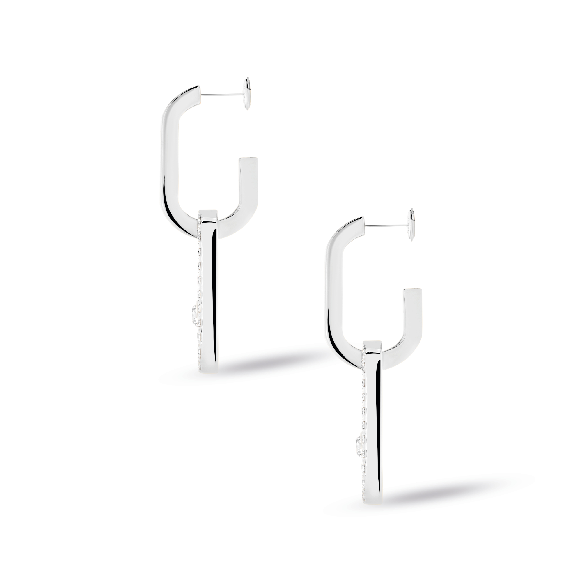 Ref. 12469-WG - Die Move Link Kollektion interpretiert die Gliederkette neu, indem sie die Kurven des Move-Kultmotivs der Juweliermaison Messika abwandelt, das an seinem Goldkäfig und den beweglichen Diamanten zu erkennen ist. Bei diesen Diamantohrhängern, die Sie am Tag und am Abend tragen können, zeigt es sich in einer rockigeren und gewagteren Version mit imposanten Konturen. Dank des Alpa-Systems bleiben sie bei jeder Bewegung an Ort und Stelle, ohne je Gefahr zu laufen, sie zu verlieren. Die mit Diamanten ausgefassten Ohrringe aus Gelbgold, Roségold oder Weißgold sind ein zeitloses und luxuriöses Schmuckstück, das jeden Stil sofort aufwertet. Das Plus: ihre ideale Länge, die mit jeder Gesichtsform harmoniert.