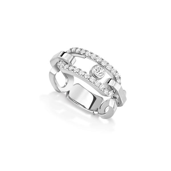 Ref. 12728-WG - Ein kühner und moderner Diamantring. Mit dem Move Link Ring entwirft Valérie Messika ein luxuriöses Schmuckstück mit rockiger Ausstrahlung, das all jene verführen wird, die ihren Stil kompromisslos unterstreichen möchten. Dieser Luxusring, der sowohl im Alltag als auch zu besonderen Anlässen getragen werden kann, zeichnet sich durch das Move-Motiv aus, eine Ikone der Maison, die sich in einer XXL-Version neu erfindet, vollständig mit Diamanten ausgefasst und nach wie vor mit dem beweglichen Diamanten besetzt ist, der bei jeder Bewegung mitschwingt. Weißgold, Roségold, Gelbgold ... Es steht jedem frei, den Messika Diamantring zu wählen, der am besten zum eigenen Stil passt.