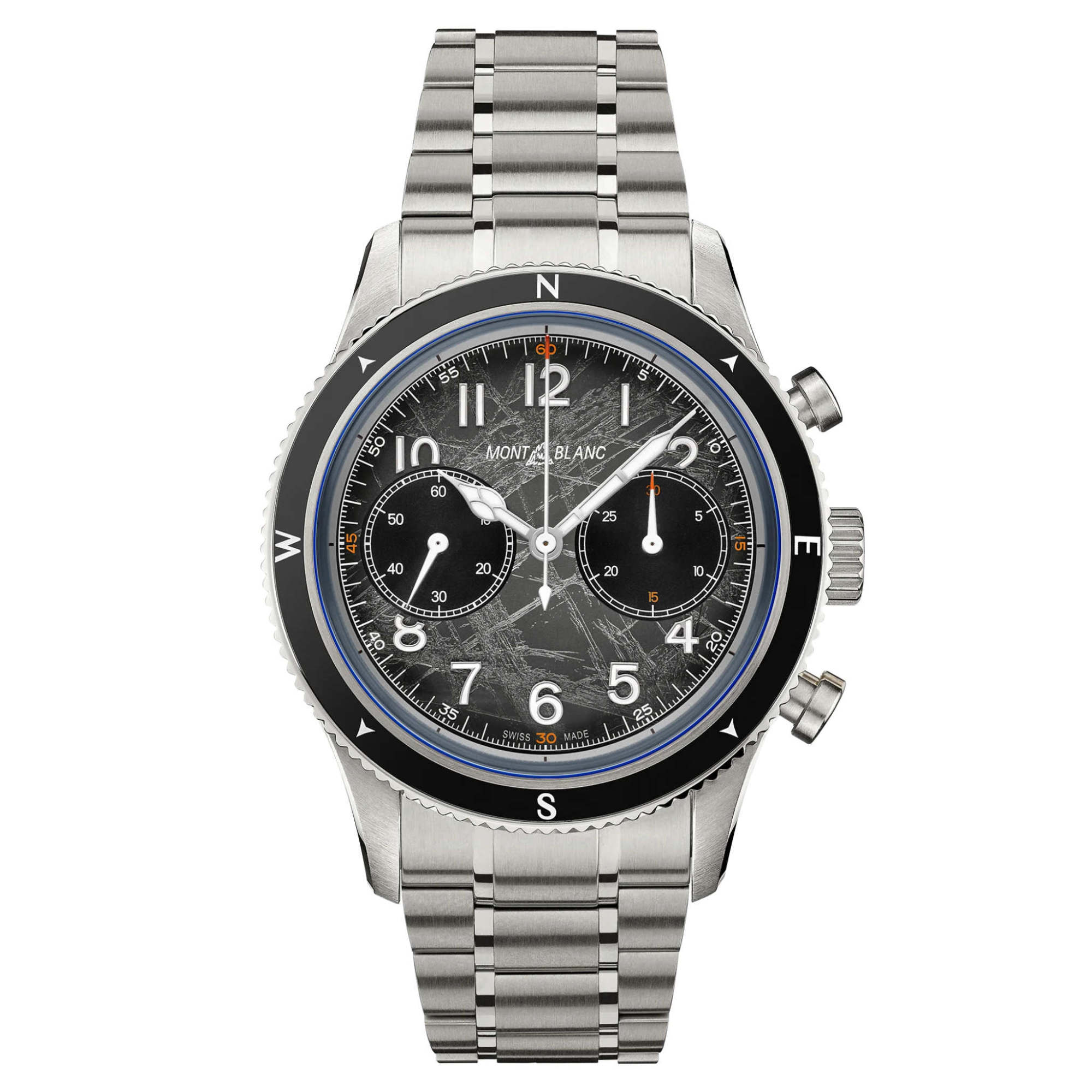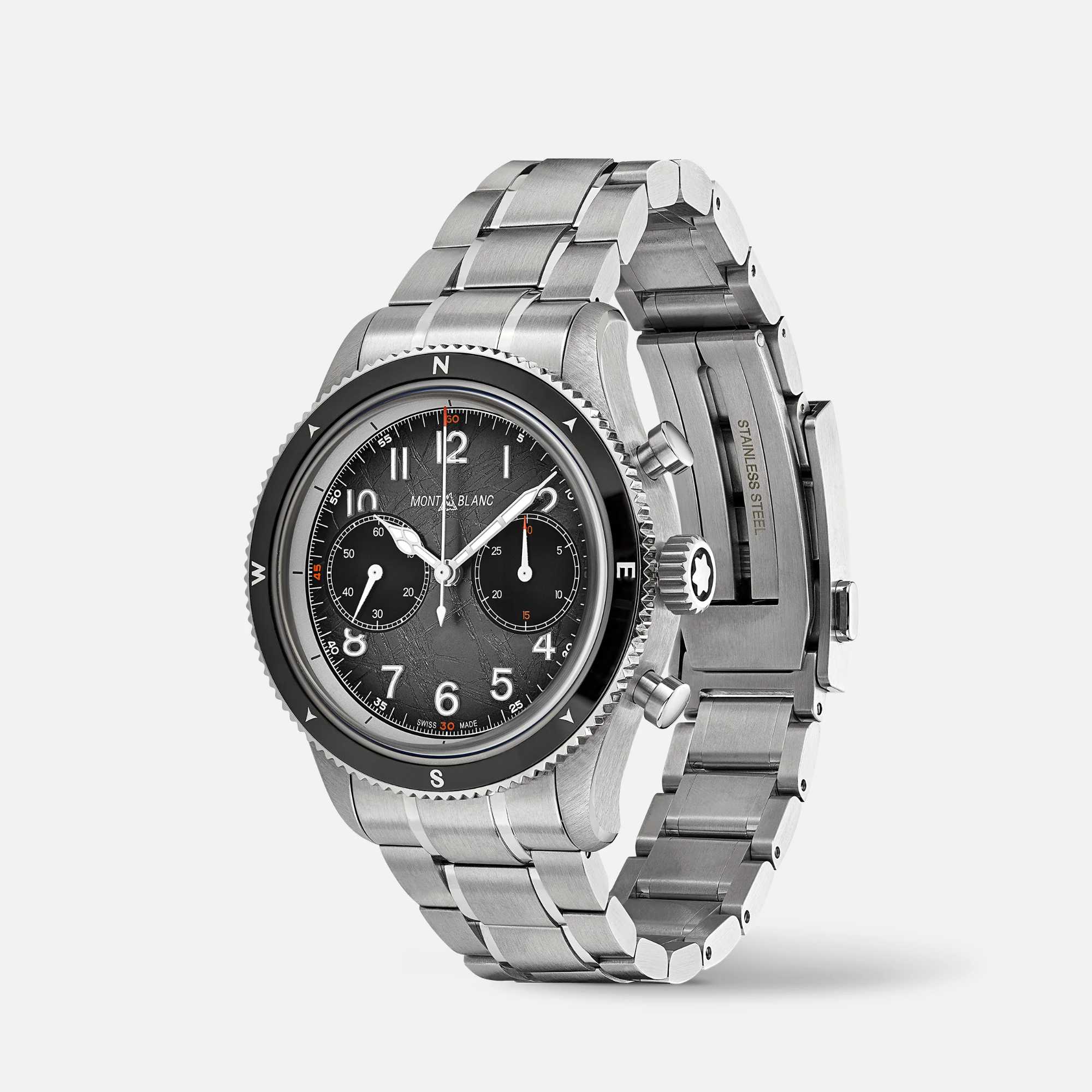Das Vermeiden von Feuchtigkeitsbildung und Oxidation ist für die Entdecker von großem Vorteil, da das Uhrwerk so länger und präziser funktioniert. Angetrieben wird die Uhr vom MB 25.13 Automatikchronographen. Sie verfügt über eine geriffelte, beidseitig drehbare schwarze Keramiklünette mit leuchtenden Himmelsrichtungen sowie über ein dunkelgraues Sfumato-Zifferblatt mit Gletschermotiv, orangefarbenen Akzenten und blauen Leuchtelementen.