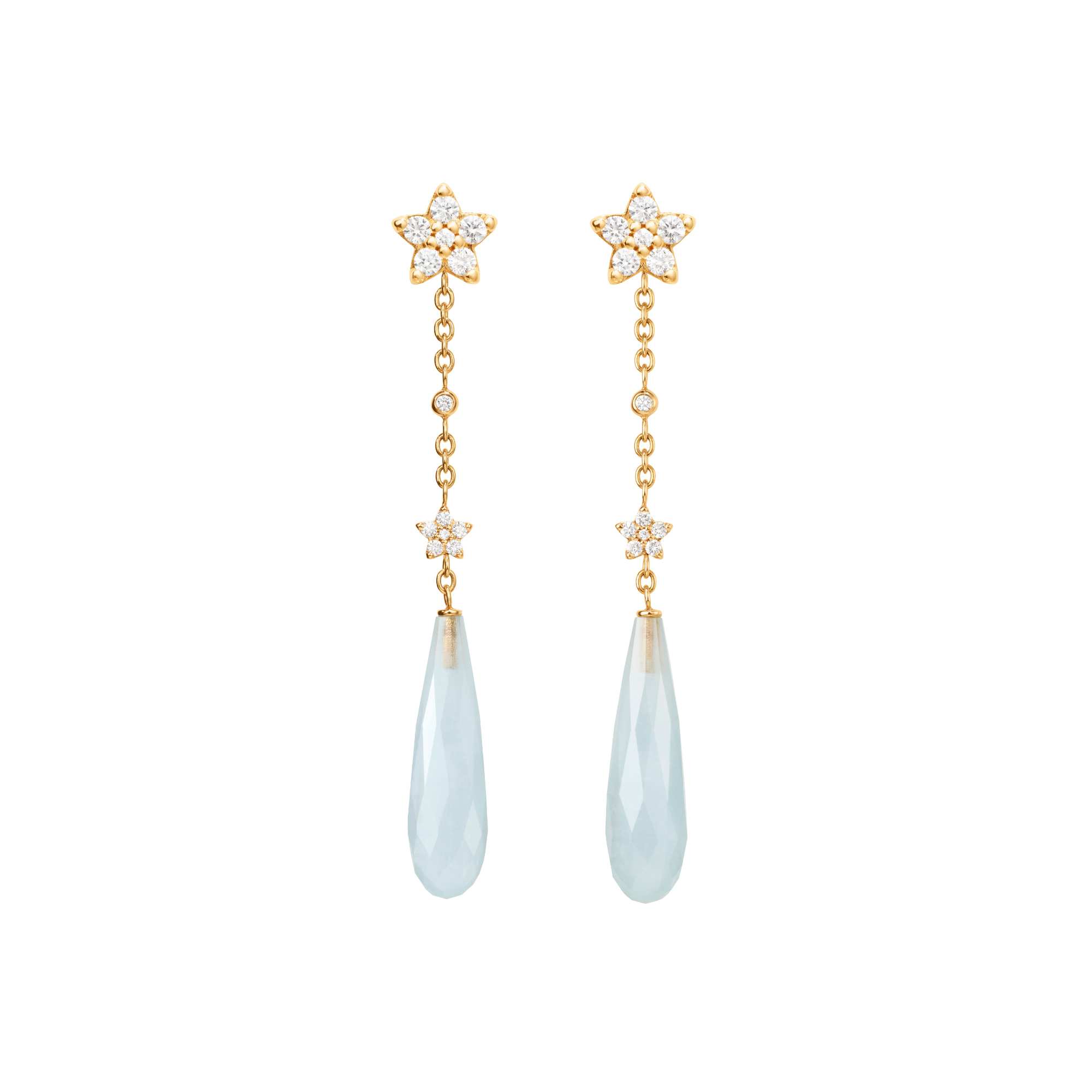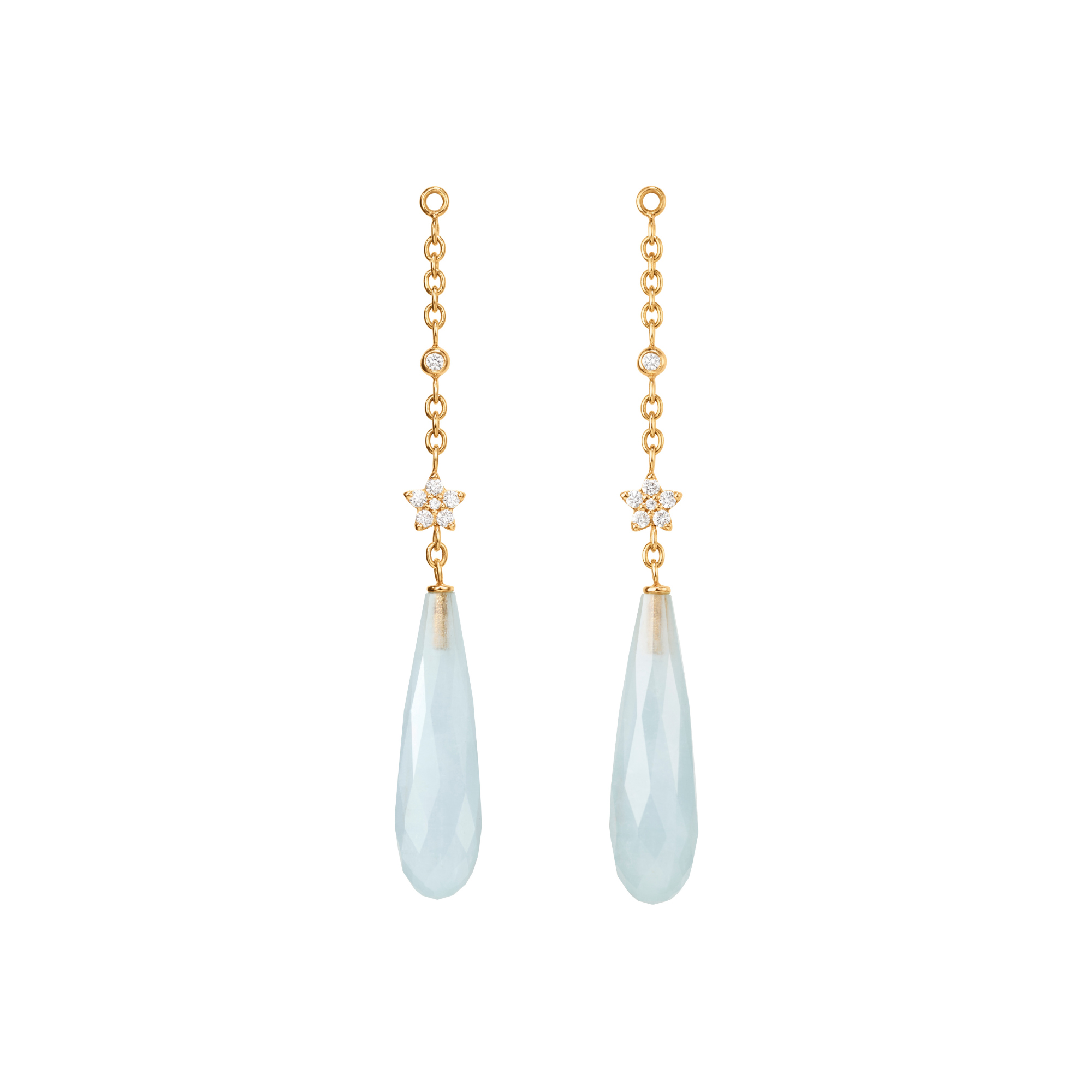 Ref. A2862-413 - Der von Charlotte Lynggaard entworfene Shooting Stars Ohrring-Anhänger besteht aus 18 Karat Gelbgold und 14 Diamanten von insgesamt 0,12 ct. TW. VS. Der facettierte Aquamarin-Tropfen ist 22 x 6 groß, und die Gesamtlänge des Anhängers beträgt 5,2 cm. Handgefertigt von Goldschmiedemeistern. Verkauf als Paar.