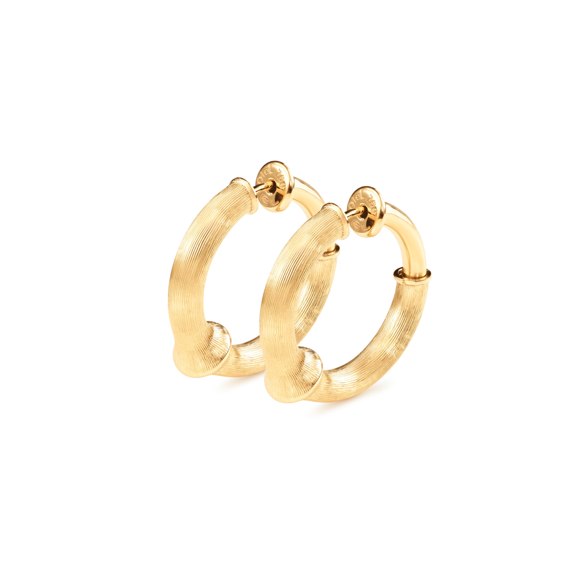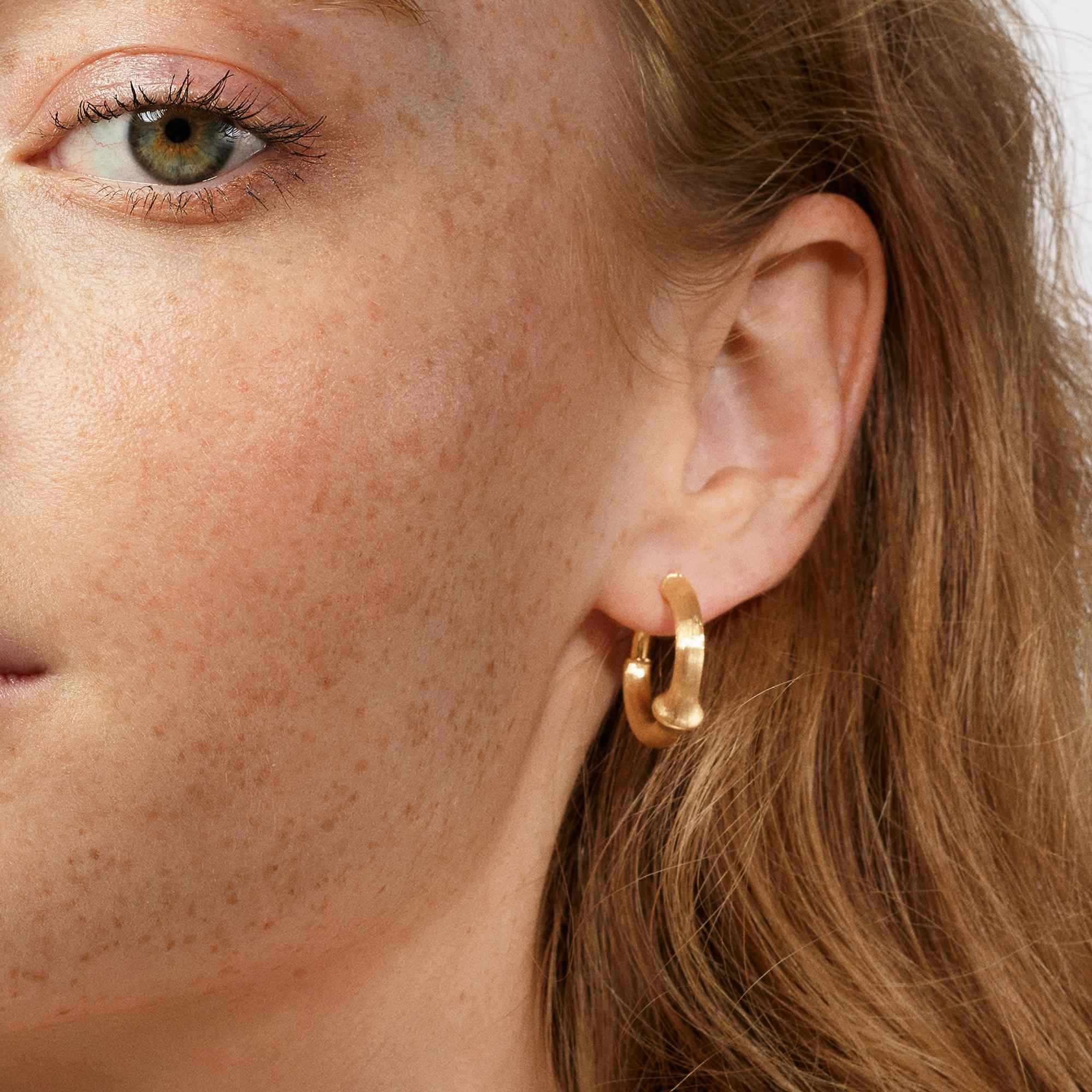 Ref. A3043-401 - Die von Charlotte Lynggaard entworfenen Nature Creolen-Ohrringe klein sind aus 750/- Gelbgold gefertigt. Die Oberflächen der Ohrringe mit 21 mm Durchmesser sind von Goldschmiedemeistern von Hand satiniert. Als Paar zu erwerben. Teil der Nature Collection.