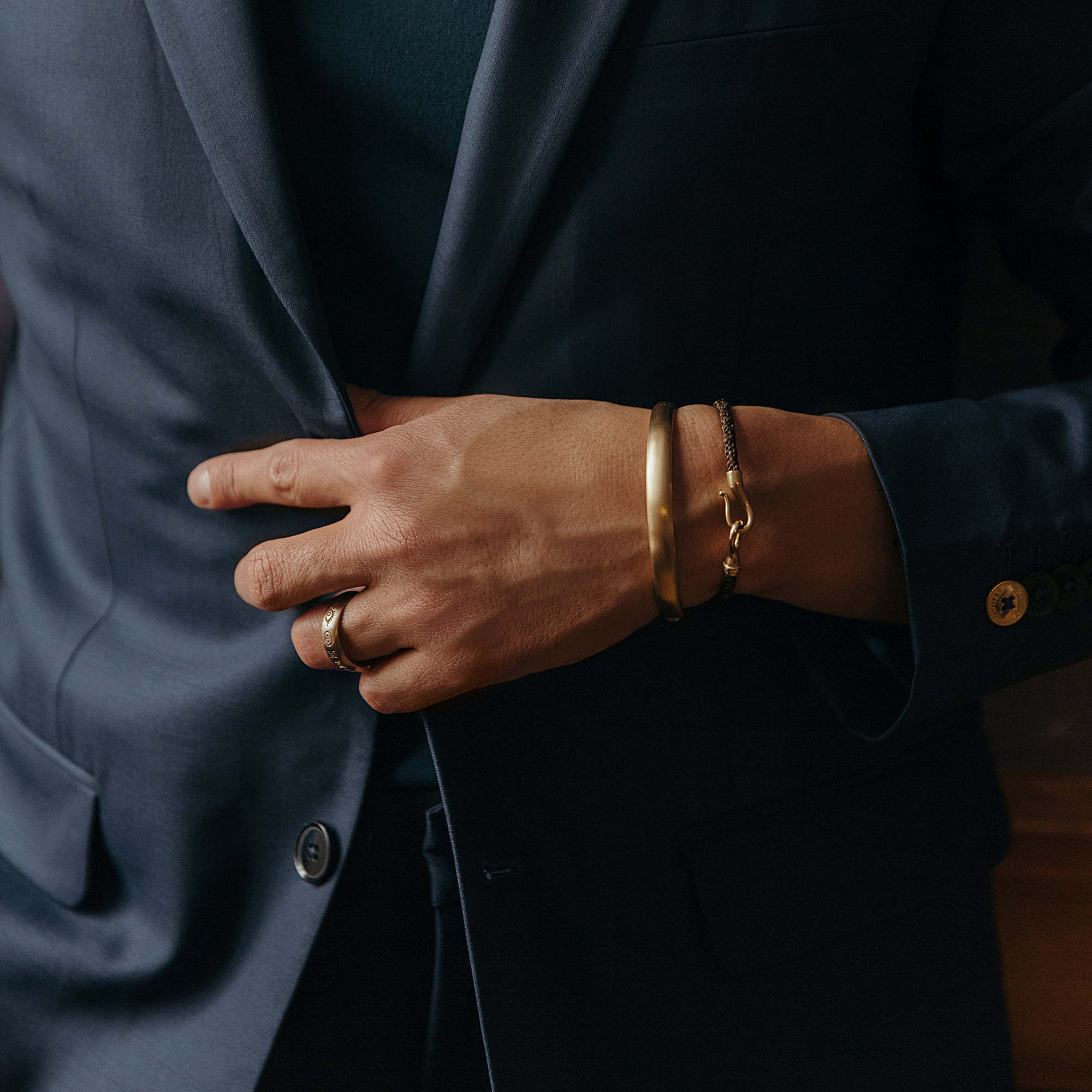 Ref. A3053-401 - Charlotte Lynggaard schuf das geprägte Manschettenarmband als Weihnachtsgeschenk für ihren Sohn Julius, das sich ebenfalls in einer Auswahl von Ringen entwickelte. Jeder kleine Stempel grüßt auf subtile Weise einen der Männer der Familie Lynggaard.