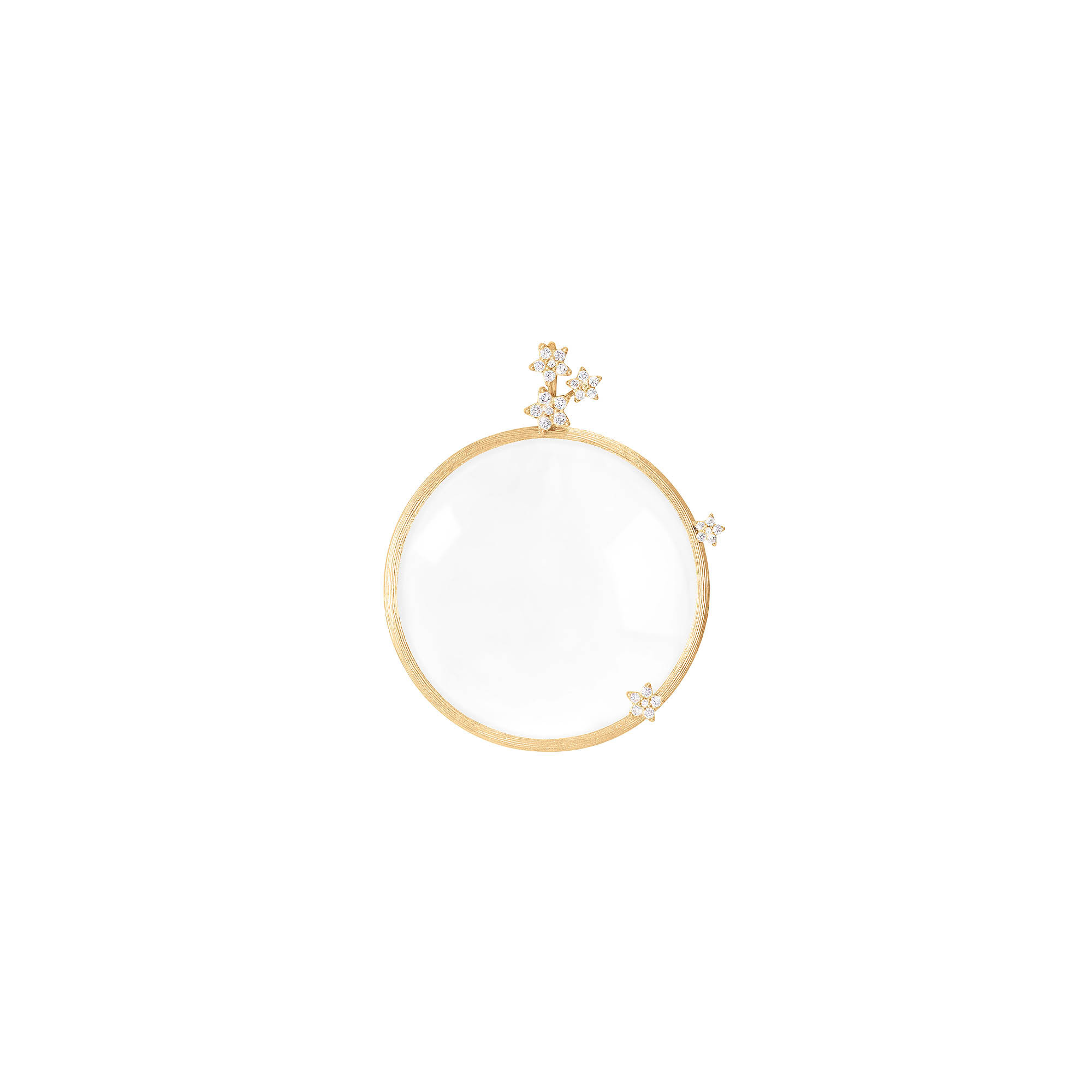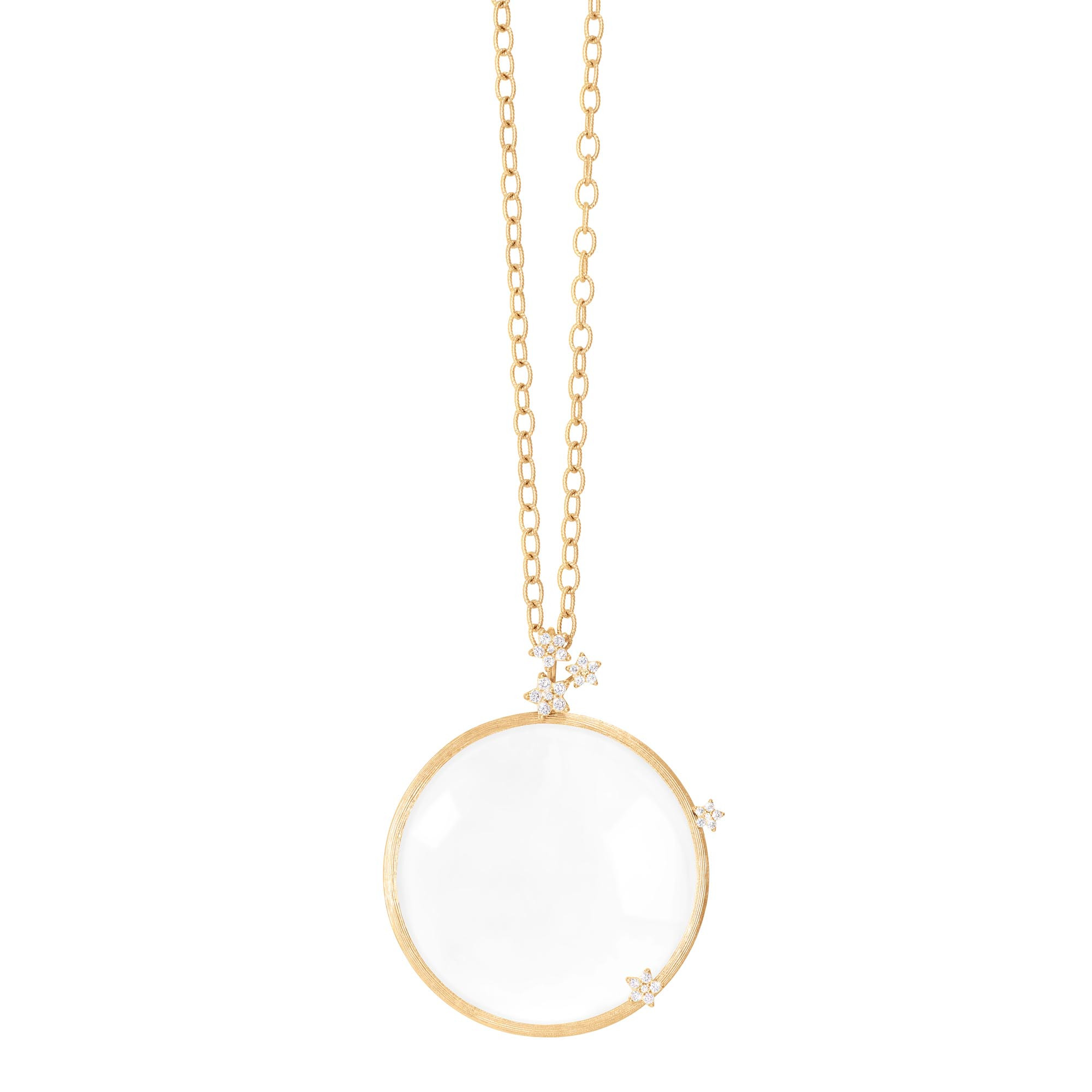 Ref. A3070-401 - Der von Charlotte Lynggaard entworfene Shooting Stars Diamant-Monokel-Anhänger ist aus 18 Karat Gelbgold gefertigt und mit 30 Diamanten von 0,3 Karat TW.VS besetzt. Die mineralische Lupe ist +6. Jeder der 5 Sterne hat eine leicht konvexe Rückseite und besteht aus 6 Diamanten im Brillantschliff, die von der Oberfläche abgehoben sind, um Licht durch die Facetten zu lassen. Die satinierten und polierten Goldoberflächen werden von Goldschmiedemeistern von Hand veredelt.