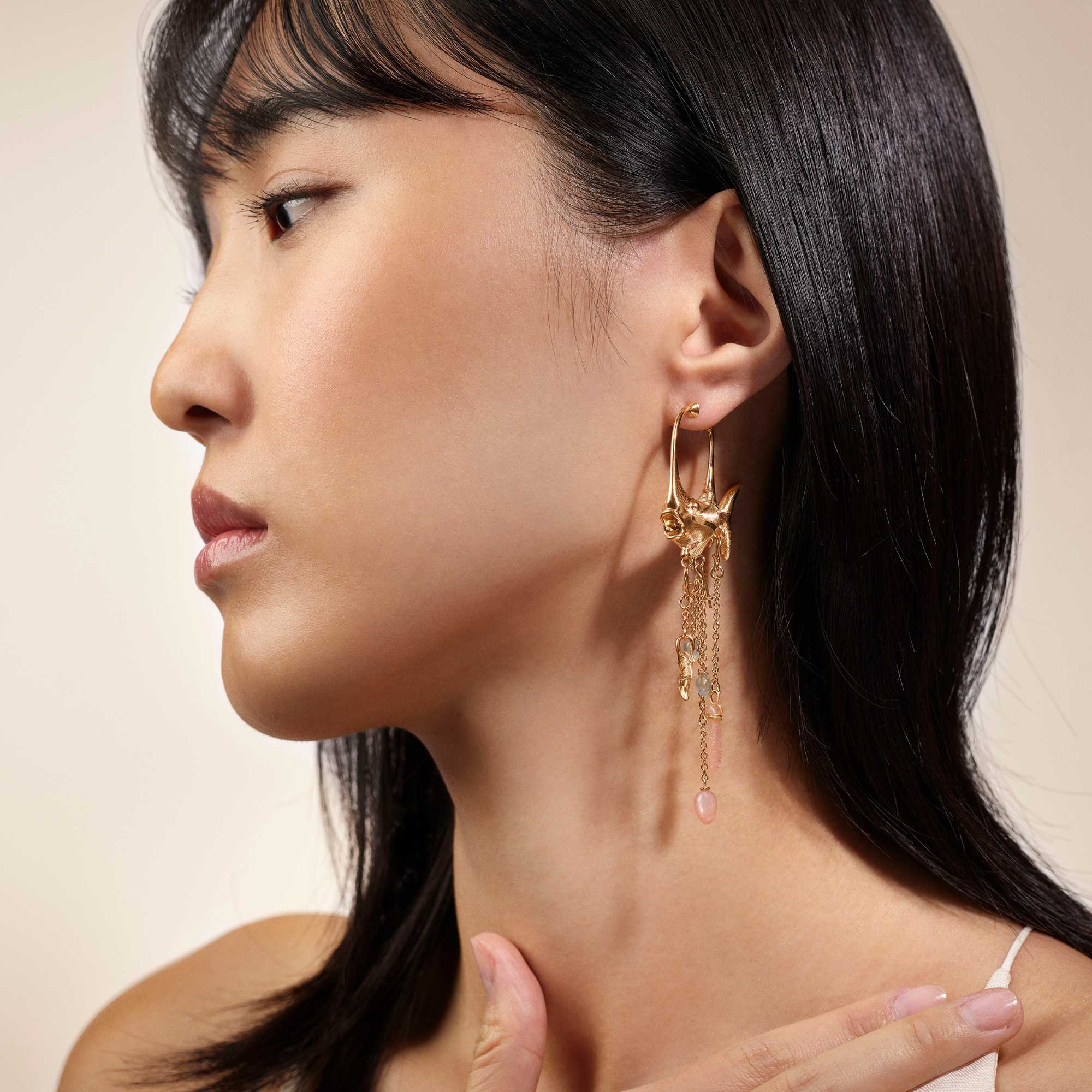 Ref. A3160-401 - Von Sofia Lynggaard Normann entworfen. Dieser Young Fish-Ohrringanhänger ist aus 18-karätigem Gelbgold gefertigt und mit einem Aquamarin und einem Serpentin in Tropfenform versehen. Die Gesamtlänge des Anhängers beträgt 5,3 cm. Wird als Einzelstück verkauft. Teil der Young Fish-Kollektion.