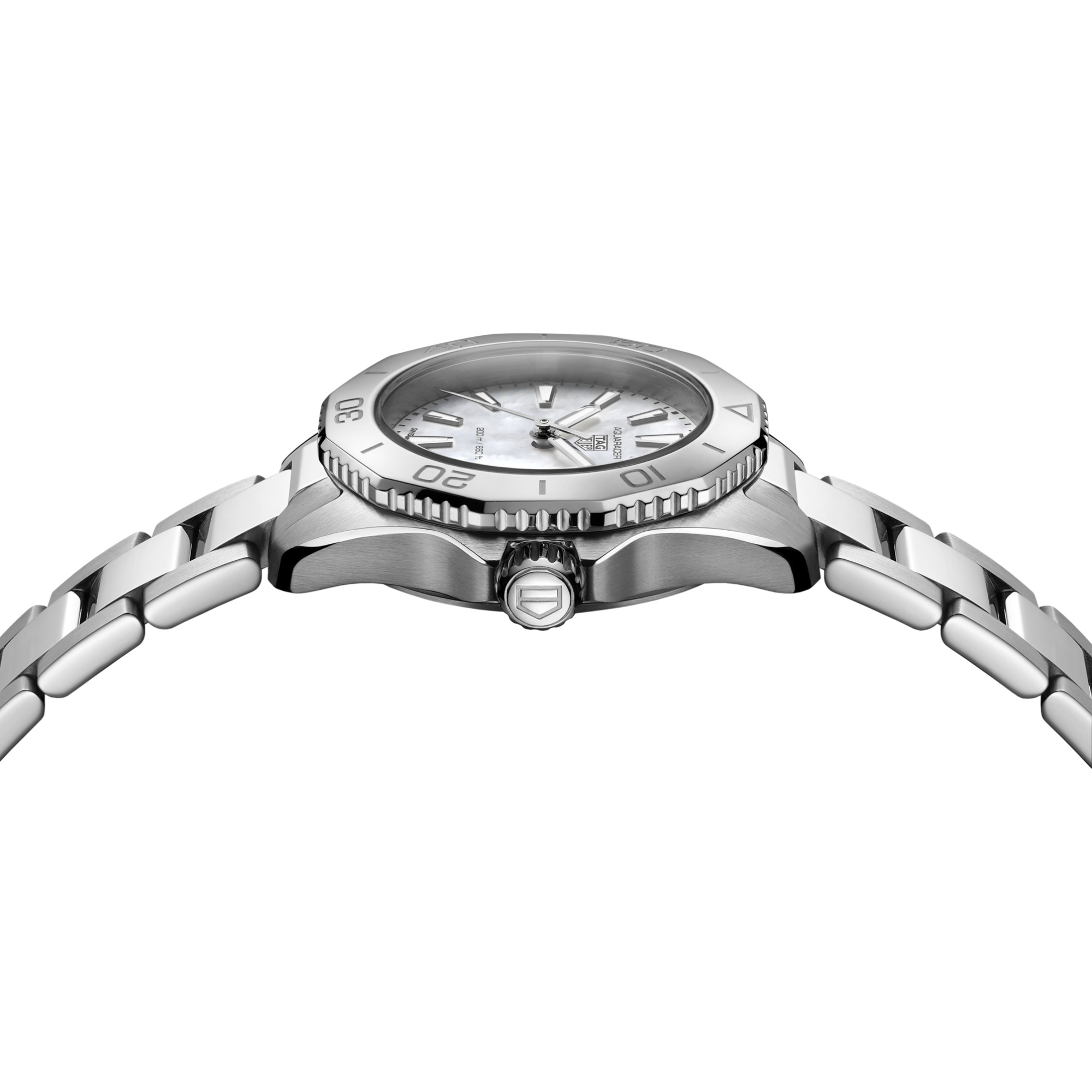Ref. WBP1418.BA0622 - Mit ihrem zarten weißen Perlmuttzifferblatt schafft diese 30 mm große TAG Heuer Aquaracer die richtige Harmonie zwischen Eleganz und technischer Raffinesse. Mit dem extrem widerstandsfähigen Edelstahlgehäuse, der Lünette mit 60 Minutenskala und dem Armband ist diese Uhr bereit, mehr zu leisten.