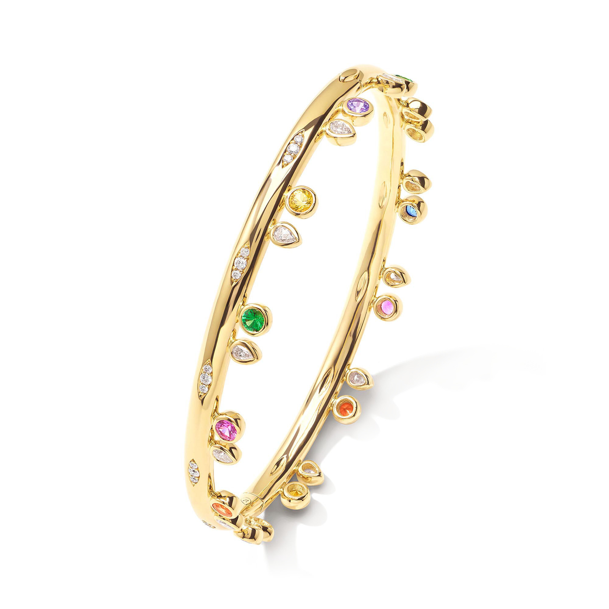 Ref. BA-Gyp-Can-17-yg - Der GYPSY Armreif aus 18 Karat Gold feiert den verspielten Geist der Color Story 'Candy' mit einer leuchtenden Mischung aus Rosa-, Grün- und Blautönen, akzentuiert durch tropfenförmige Diamanten im Brillantschliff. Erhältlich in vier Größen, kann der Armreif enger anliegend für einen eleganten Look oder eine Nummer größer für einen lässigen Boho-Stil getragen werden. Ein vielseitiges Design, das sich mühelos mit anderen Lieblingsstücken kombinieren lässt.