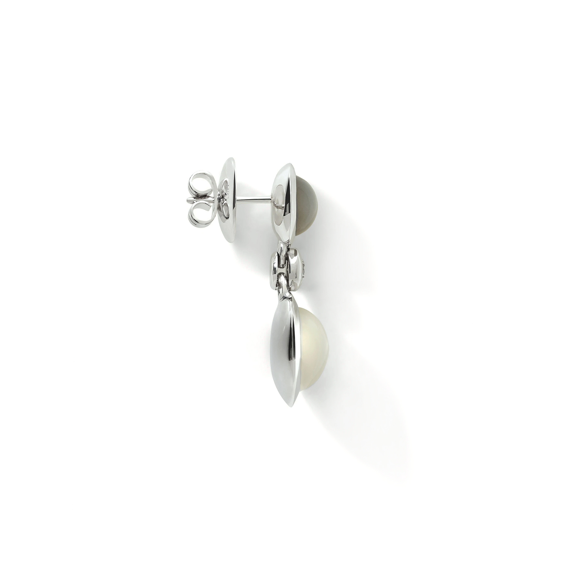 Ref. E-BOU-2-Cas-Cl-wg - Die BOUTON 2 Cabochons Ohrringe aus 18 Karat Gold präsentieren die sanften Neutraltöne der Color Story 'Cashmere' und kombinieren grauen mit leuchtendem sandfarbenen Mondstein. Verbunden durch einen funkelnden weißen Diamanten schmücken diese ausdrucksstarken Ohrringe das Ohr mit höchster Handwerkskunst und farbenprächtigen Details.