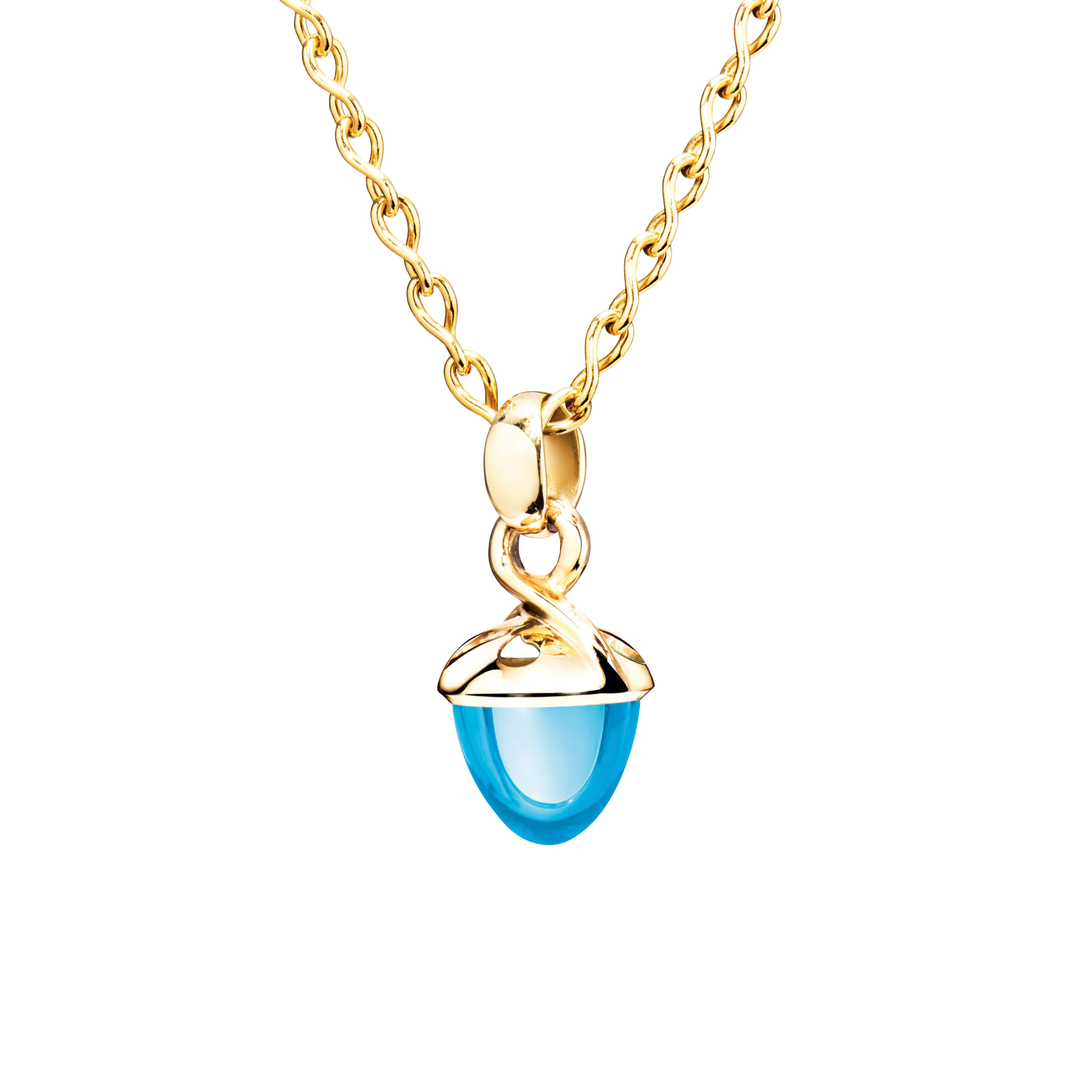 Ref. P-MB-f-ToSw-yg - Der ikonische MIKADO Bouquet Fairy Anhänger präsentiert einen leuchtenden hellblauen Swiss-Topas in der charakteristischen kegelförmigen Form, gefasst in 18 Karat Gold. Das filigrane Kappendesign lässt das Licht durch den Edelstein fließen, verstärkt seine Brillanz und offenbart seine volle Schönheit. Ideal zum Mix & Match, Sammeln und Verschenken.