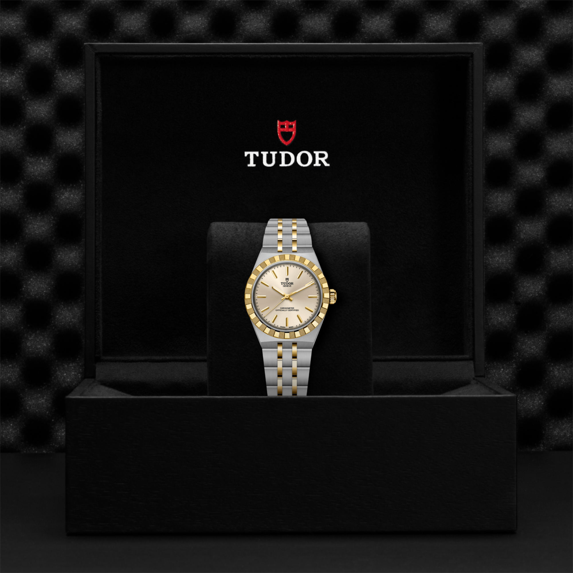 Ref. M2830A1A3-0003 - Mit ihrem integrierten Metallarmband, das nahtlos in das Gehäuse übergeht, zeichnet sich die TUDOR Royal durch ein fließendes und stilsicheres Design aus. Charakterisiert durch ihre drei breiten satinierten Bandelemente, zwischen denen zwei schmalere polierte Elemente positioniert sind, und ihre „T-fit“-Schließe, betont die glatte Beschaffenheit ihrer Oberflächen die große Aufmerksamkeit, die TUDOR dem Tragekomfort schenkt. Erhältlich in Edelstahl oder mit abwechselnden Elementen in Edelstahl und Gelbgold, sprechen die Modelle dieser Linie mit ihrer fein bearbeiteten Oberfläche jeden Geschmack an.